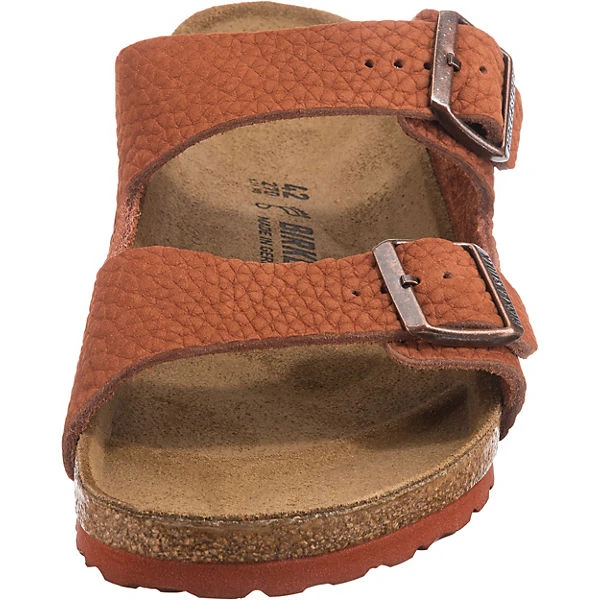 Perfekt für jeden Tag: Die alltagstauglichen Pantoletten der Marke BIRKENSTOCK. Dieses Schuhpaar kommt ohne Verschluss aus, sodass ganz einfach hineingeschlüpft werden kann. Für ein komfortables Trageerlebnis besteht die Decksohle aus Leder. Das Fußbett folgt der natürlichen Fußform, so dass der Fuß unterstützt wird. Die besondere Optik des Nubukleders entspringt der geschliffenen, angerauten Oberflächenbeschaffenheit.