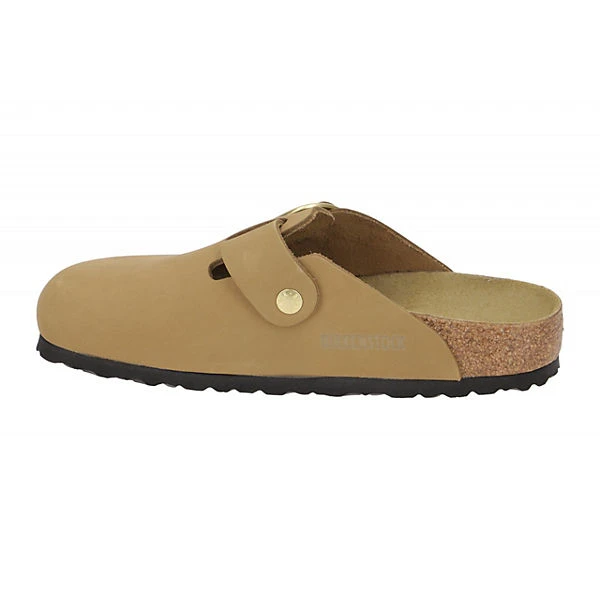 Hersteller: Birkenstock Hersteller Art-Nr.: 1017952 Modellname: BOSTON BIG BUCKLE Machart: UNISEX Damen- und Herrenschuhe, Pantoletten – Clogs Farbe: hellbraun + gold + Sohle in schwarz (mud green) Obermaterial: Echtleder – Nubuck (nubuk) Innenfutter: Echtleder Innensohle: Echtleder Komfort Fußbett Wechselfußbett: nicht herausnehmbare Innensohle Laufsohle: EVA (Ethylenvinylacetat) – leicht und widerstandsfähig Verschluss: Schnalle Absatzart: flach – kein Absatz Schuhform: rund Größenhinweis: fällt normal aus Weitenangabe: Normale Weite / Regular Fit