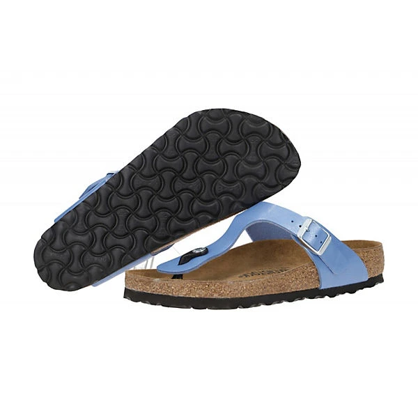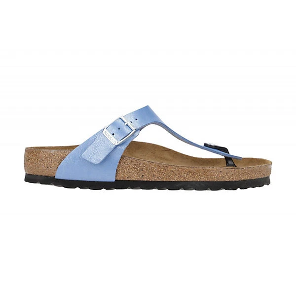 Hersteller: Birkenstock Hersteller Art-Nr.: 1021480 Modellname: GIZEH BS Machart: Damen Pantoletten – Zehentrenner Pantolette Farbe: hellblau + braun + Sohle in schwarz (graceful riviera blue) Obermaterial: Synthetik (Birko-Flor) Innenfutter: Textil Innensohle: Anatomisch geformtes Kork-Latex-Fußbett mit Lederbezug Wechselfußbett: nicht herausnehmbare Innensohle Laufsohle: EVA (Ethylenvinylacetat) – leicht und widerstandsfähig Verschluss: Schnalle Absatzart: flach – kein Absatz Schuhform: rund Größenhinweis: fällt normal aus Weitenangabe: Normale Weite / Regular Fit