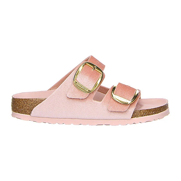 Die rosa farbene Birkenstock Pantolette Modell Arizona überzeugt nicht nur mit dominanten, goldenen Schnallen und einem edel schimmernden Samt-Upper, sondern bietet zudem besten Tragekomfort auf der Basis natürlicher Materialien. Das für Birkenstock typische Kork-Latex-Fußbett mit seinen anatomischen Ausformungen unterstützt und entlastet den Fuß haltgebend. Gelenke und Rücken werden geschont. Gleichzeitig trainiert es die Beinmuskulatur, was Ihre Gesundheit unterstützt und Ihr Wohlbefinden steigert.