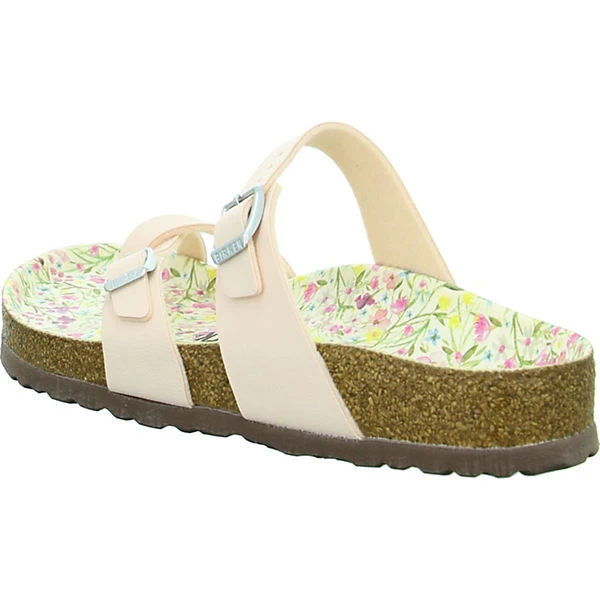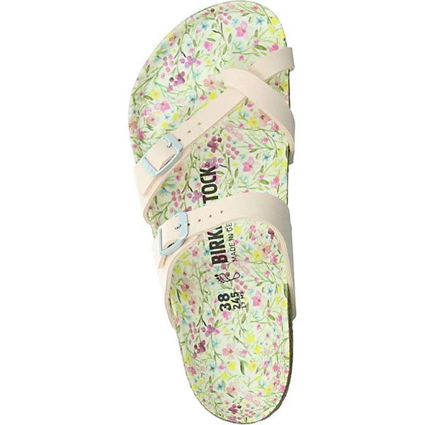 Birkenstock Damen Zehentrenner/ Pantoletten MAYARI Rosa Synthetik – Obermaterial aus Birko-Flor – 2 verstellbare Schnallen zur optimalen Anpassung – komfortable Fußbettung aus Naturkork für ganztägigen Tragekomfort – Decksohle mit Blumenmuster bedruckt